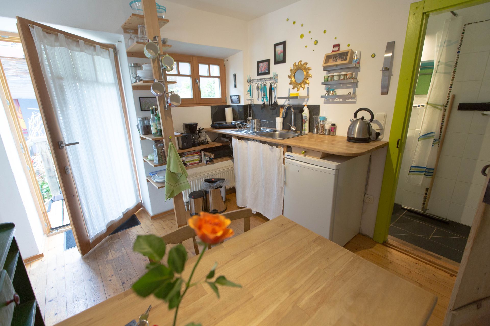 Unsere Ferienwohnung 2 besteht aus einer Küche, einem kleinen Bad und einem separaten Schlafzimmer.