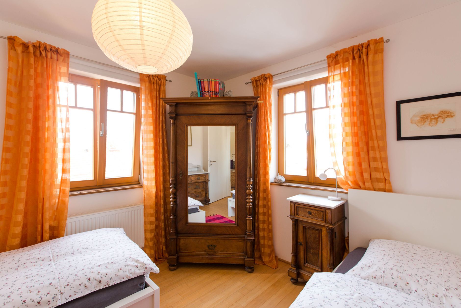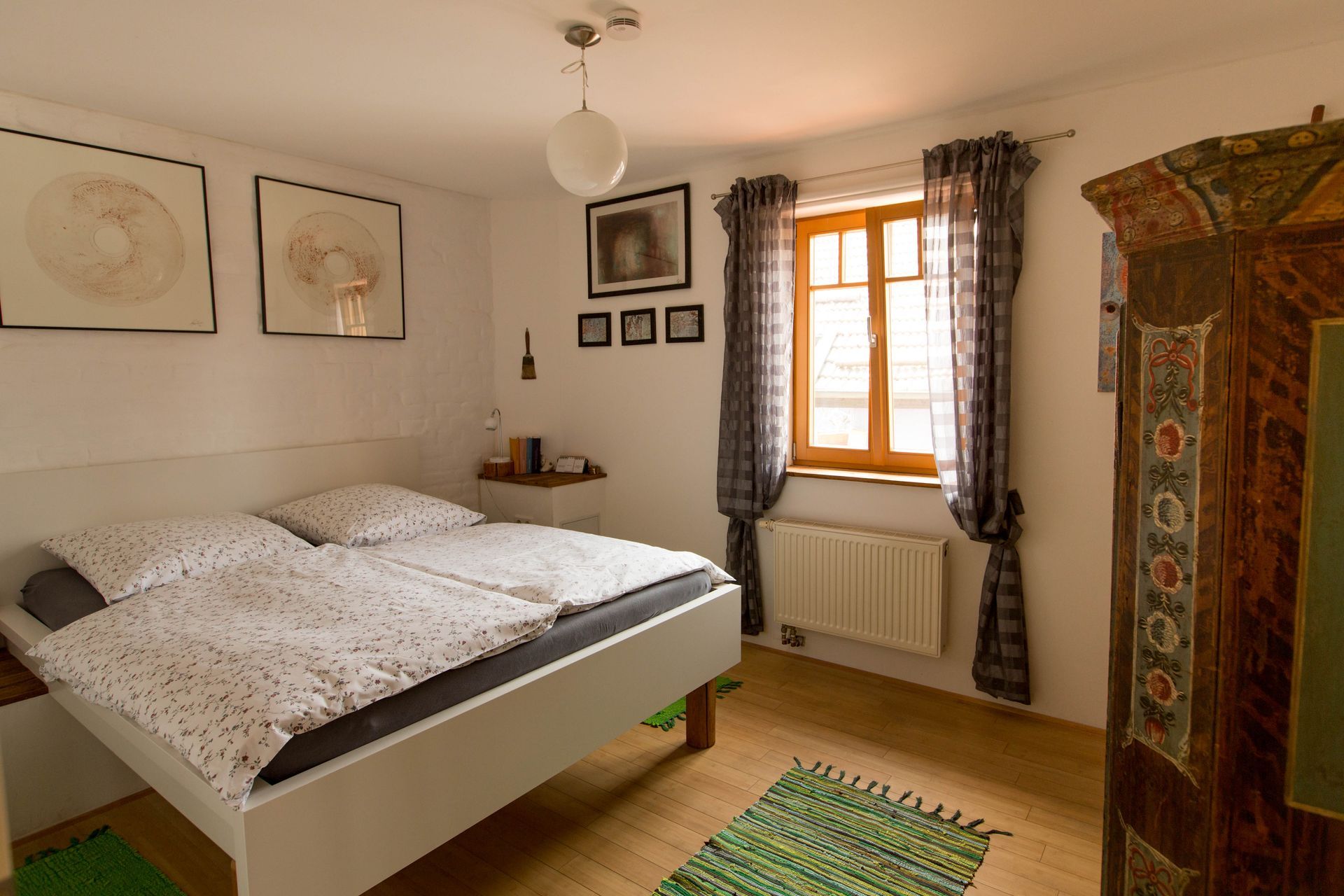 Unsere Ferienwohnung 4 besteht aus einer geräumigen Küche, einem großen Bad und zwei separaten Schlafzimmern. In einem der Schlafzimmer befindet sich ein Doppelbett, im anderen zwei getrennte Betten.